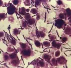 Bakterium, dessen Zellen aus langen Stäbchen bestehen, während seine Sporen die